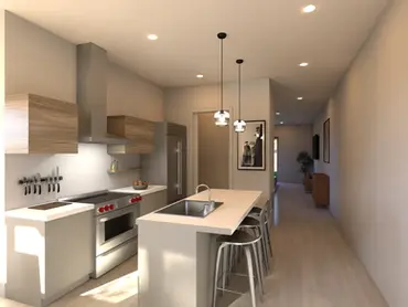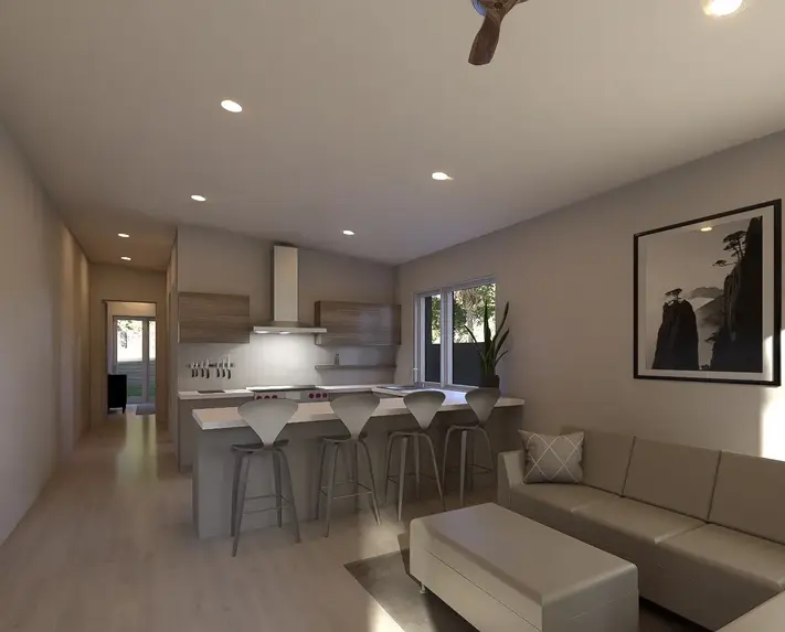 The Reilly is a side-by-side duplex — a two-story, three-bedroom family home and a fully independent one-bedroom residence.