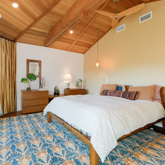 The primary suite, affectionately called the Bali Hai Room after one of San Diego’s most iconic waterfront landmarks, features cedar-clad vaulted ceilings and expansive windows that frame the surrounding trees—creating a serene, treehouse-like escape filled with natural light.